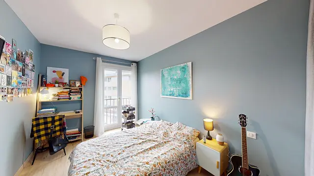 Cette chambre lumineuse, grâce à une grande porte-fenêtre qui donne sur un petit balcon, est louée avec un bureau, un lit double, une télévision et une penderie.