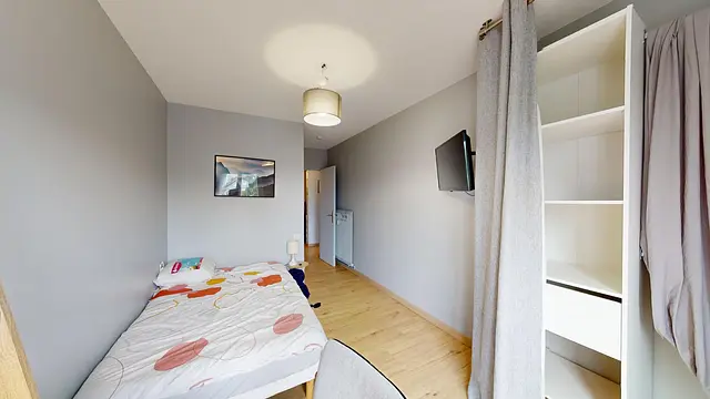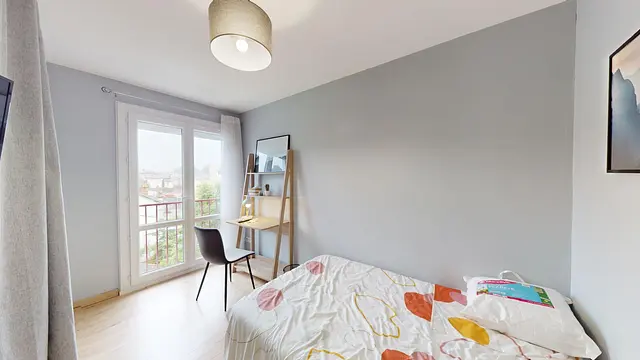 Cette chambre lumineuse, grâce à une grande porte-fenêtre qui donne sur un petit balcon, est louée avec un bureau, un lit double, une télévision et une penderie.