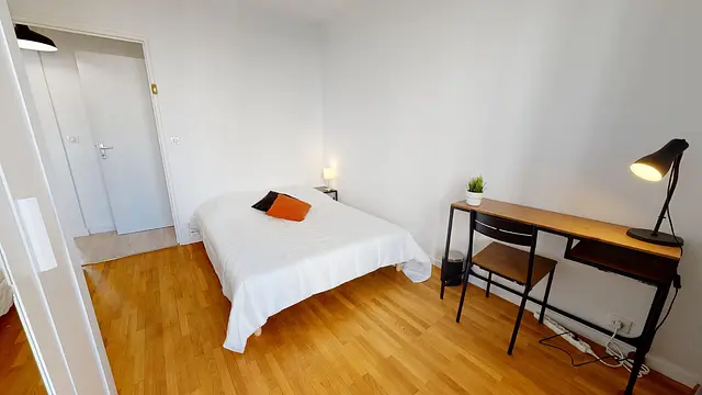 La chambre 3 de 11m2 est située au fond du couloir à droite. Cette chambre est aménagée avec un lit double, un bureau, une chaise, un placard de rangement et offre un accès direct à un balcon filant !