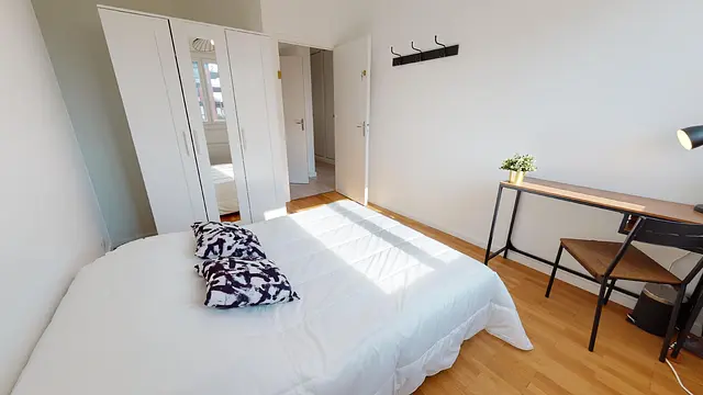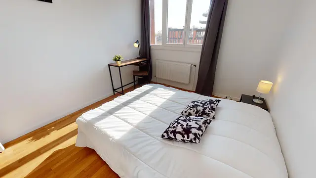 La chambre 2 mesure 11m2. Cette chambre est équipée de tout le nécessaire : lit double, bureau, chaise et rangements.
