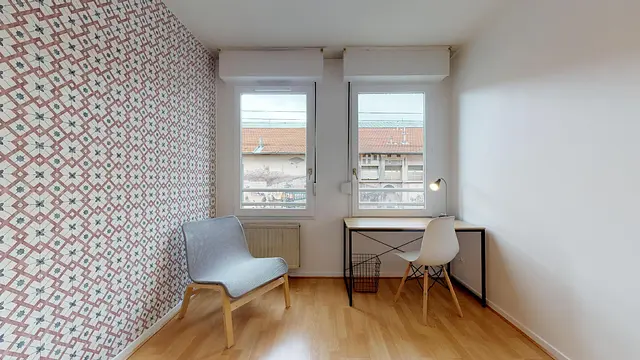 La chambre 4, sensiblement identique aux autres, offre la même luminosité. Elle est meublée d’un lit double, d’un placard mural et d’un grand bureau, ainsi que d'un fauteuil, idéal pour bouquiner.