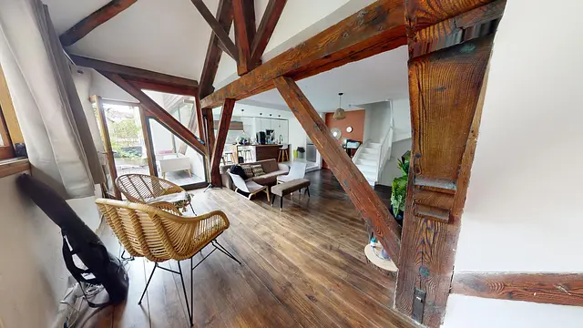 - - D'une grande pièce de vie, équipée d'un canapé, de fauteuils, d'un banc, d'une télévision, de son meuble et de divers rangements.