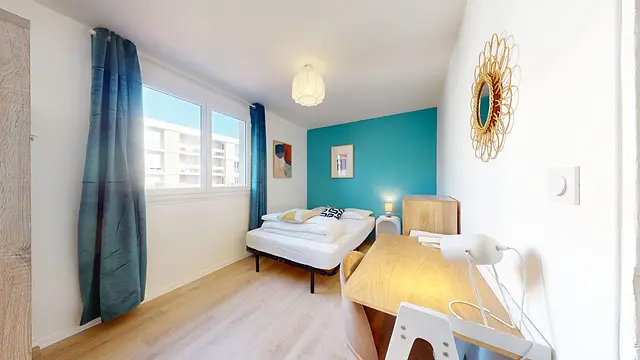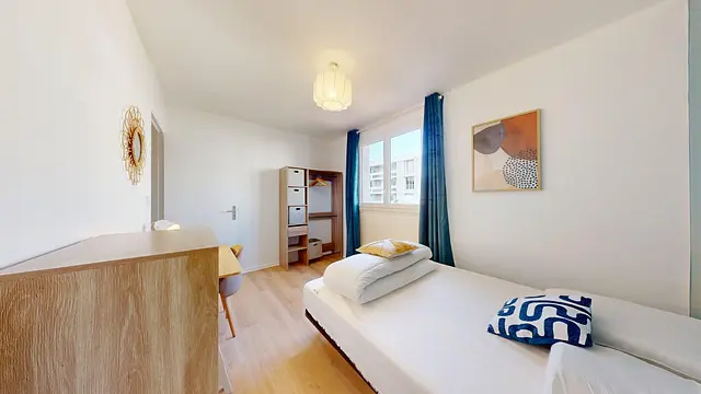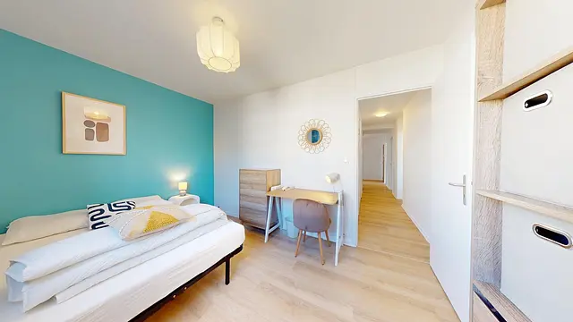 Chaque chambre est entièrement meublée et pensée pour le confort des colocataires : lit double, bureau, chaise et rangements. La décoration moderne et colorée crée un cadre de vie à la fois pratique et agréable.