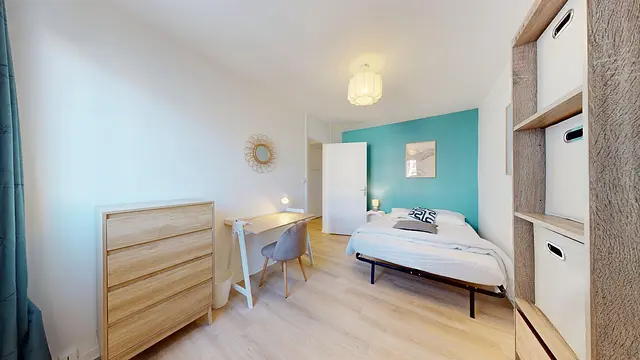 Chaque chambre est entièrement meublée et pensée pour le confort des colocataires : lit double, bureau, chaise et rangements. La décoration moderne et colorée crée un cadre de vie à la fois pratique et agréable.