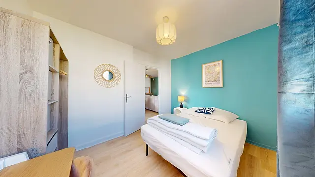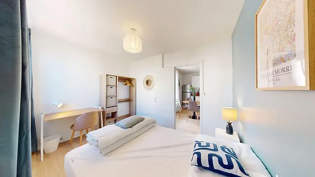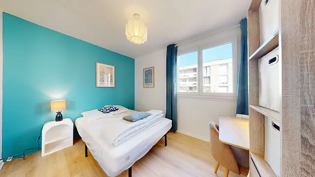 Chaque chambre est entièrement meublée et pensée pour le confort des colocataires : lit double, bureau, chaise et rangements. La décoration moderne et colorée crée un cadre de vie à la fois pratique et agréable.