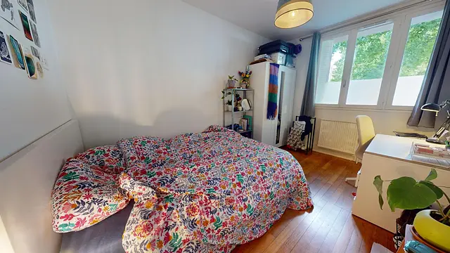 Cette chambre est équipée d'un lit deux places, d'une armoire, d'un miroir, d'un bureau ainsi que d'une fenêtre et de nombreux rangements.