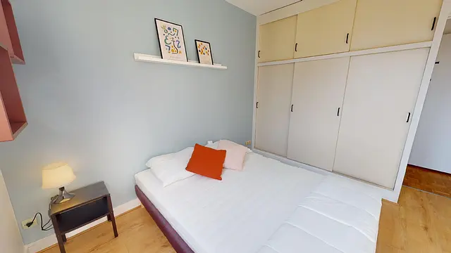 Cette chambre comporte un lit double, un bureau, une chaise et des rangements.