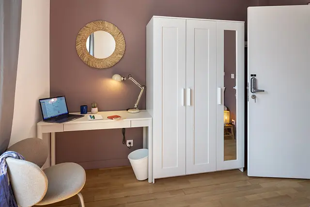 La chambre est composée d'un lit double, d'un bureau avec une chaise. Également, vous disposez d'un placard.