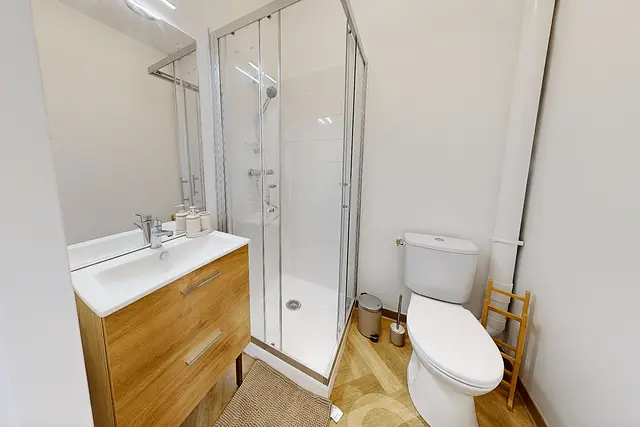 Vous disposez aussi de votre salle de bain privée, équipée d'une douche, une vasque et un toilette.