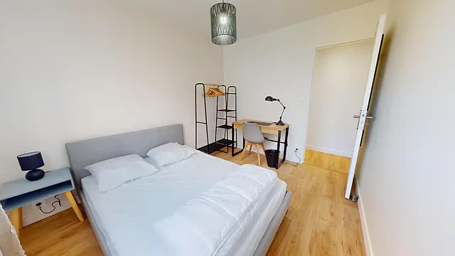 Cette chambre est équipée d'un lit double, d'un chevet, d'un dressing et d'un bureau.