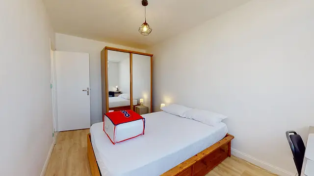 La deuxième chambre de cette colocation est équipée d'un lit double d'un placard de rangement et d"un bureau et d'une chaise