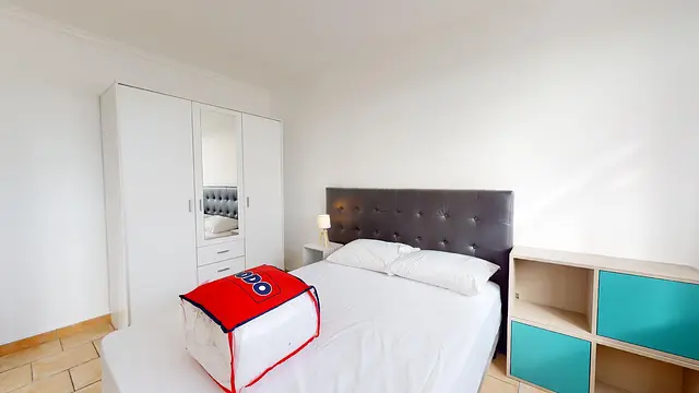 Cette chambre est meublée d'un lit double, un bureau et une chaise ainsi qu'un grand placard de rangement