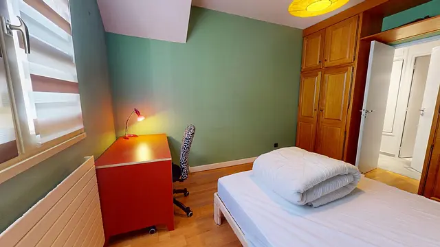 La chambre est louée avec un lit double, une table de nuit, un bureau et une très grande penderie.