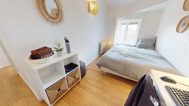 Cette chambre dispose d'un lit double, d'une table de chevet avec une lampe, d'un bureau avec une chaise, d'un meuble de rangements ainsi qu'une armoire.