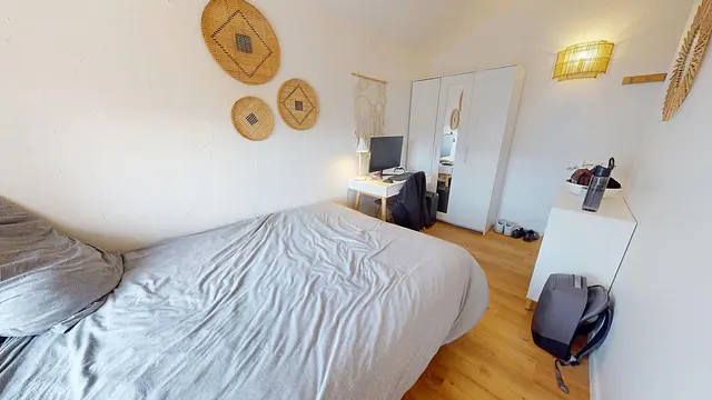 Cette colocation de quatre chambres s'ouvre sur une pièce de vie lumineuse, aménagée de deux meubles à chaussures, d'une table basse ainsi que d'une table avec quatre chaises, idéal pour partager des repas entre colocataires.