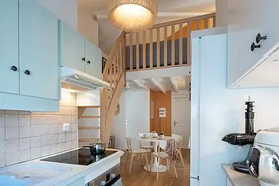 La cuisine ouverte est équipée d'un réfrigérateur et congélateur, de deux machines à café, d'une bouilloire, d'un micro-ondes, de plaques de cuisson avec une hotte, d'un four, d'un robot cuiseur, ainsi que de nombreux rangements.