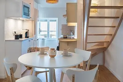 La cuisine ouverte est équipée d'un réfrigérateur et congélateur, de deux machines à café, d'une bouilloire, d'un micro-ondes, de plaques de cuisson avec une hotte, d'un four, d'un robot cuiseur, ainsi que de nombreux rangements.
