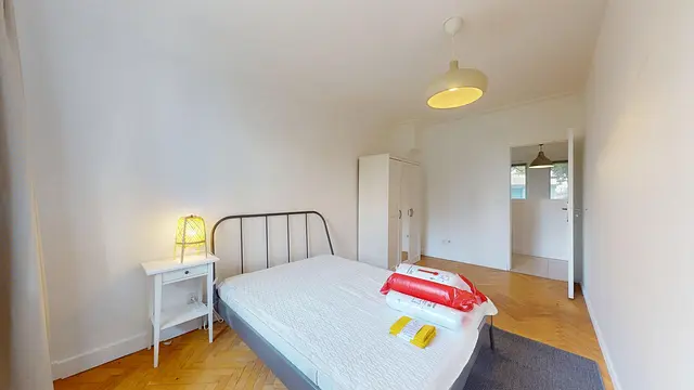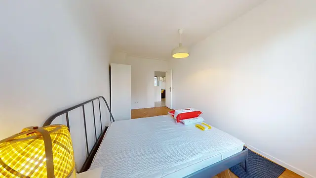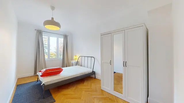 La chambre est entièrement meublée et comprend un lit double, un placard et un bureau.