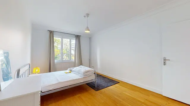 La chambre, la plus spacieuse du logement, offre une superficie de 17 m². Entièrement meublée, elle dispose d’un lit double, d’un grand placard, d’une commode et d’un bureau idéal pour étudier ou télétravailler. Elle est lumineuse et chaleureuse, sublimée par son beau parquet en bois qui lui confère une atmosphère cosy et accueillante.