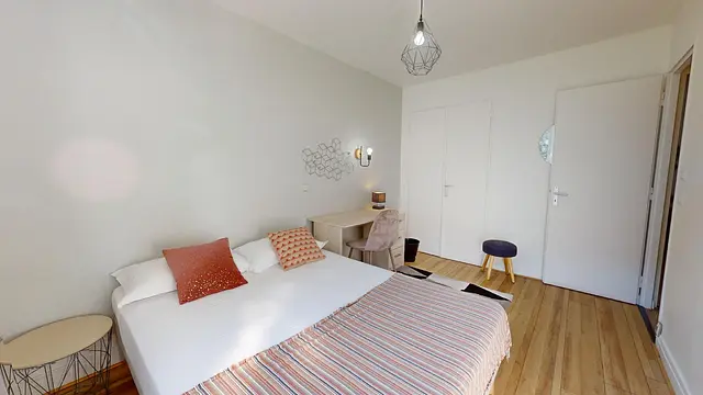 Cette chambre à la décoration soignée est équipée avec lit double, bureau, et placard de rangement.