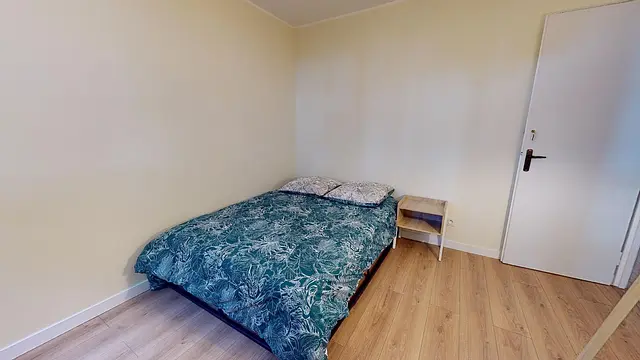 L’aménagement de la chambre 2 offre tout le confort nécessaire : lit double, des rangements (ajoutés après la réalisation de la visite virtuelle), table pouvant être un bureau, une chaise, etc.