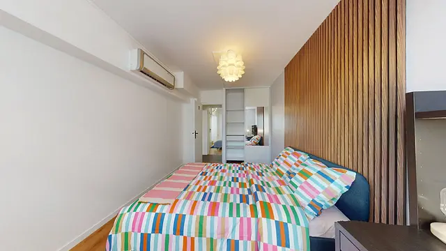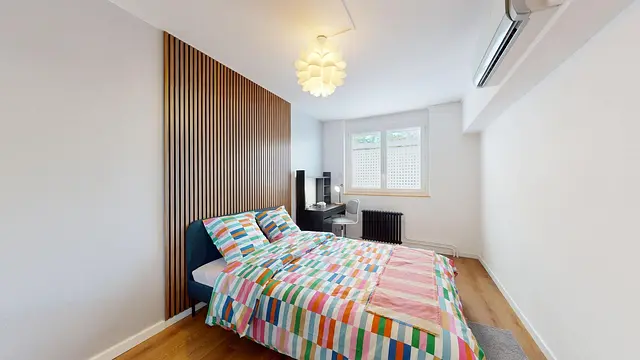 🛏️ La chambre 2 propose un lit double, un espace bureau, un grand placard avec portes coulissantes et une décoration moderne avec mur en bois et touches colorées.