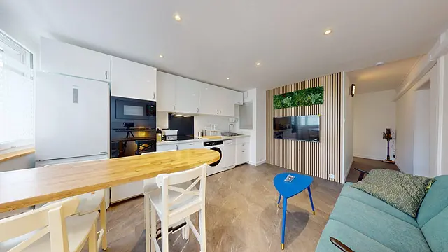 L’appartement a été pensé pour offrir confort et convivialité. La pièce de vie lumineuse réunit un salon moderne avec canapé et table basse, ainsi qu’une grande cuisine ouverte équipée (four, micro-ondes, plaques, hotte, lave-vaisselle, lave-linge et nombreux rangements). Une grande table en bois permet de partager les repas dans une ambiance chaleureuse, avec une grande TV écran plat suspendue au mur.