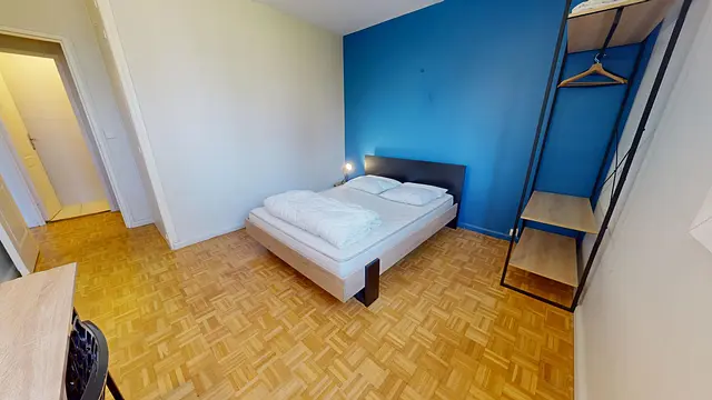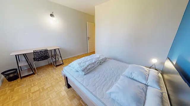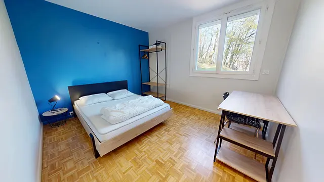Cette chambre est meublée avec un lit double, un bureau et une chaise de bureau, une commode de chevet ainsi qu'un placard de rangement.