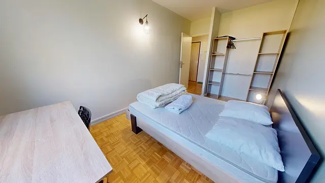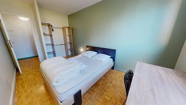 Cette chambre est meublée avec un lit double, un bureau et une chaise de bureau, une commode de chevet ainsi qu'un placard de rangement.