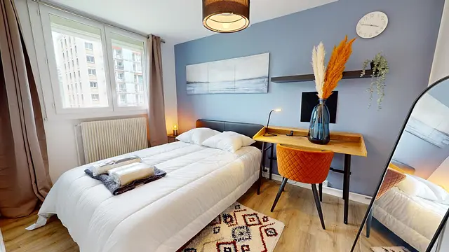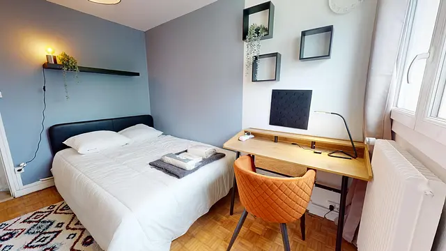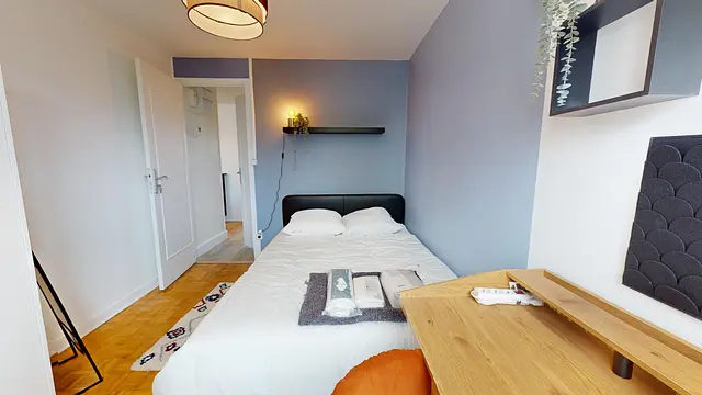 La chambre est louée avec un bureau, un lit double, un miroir et un placard. Une grande fenêtre vient illuminer cet espace.