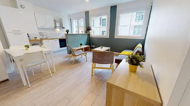 La pièce à vivre, particulièrement spacieuse et très lumineuse, offre des prestations haut de gamme et un agencement optimisé pour la colocation avec une cuisine entièrement équipée ouverte sur le salon. En matière d’électroménager, on trouve tout le nécessaire et notamment un frigo, un four, un lave-vaisselle, un micro-onde, une bouilloire et naturellement des plaques de cuisson avec hotte intégrée.
