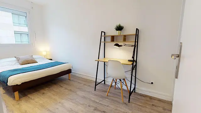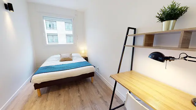La chambre 1 est meublée d’un lit double, d’une table de nuit et d’une lampe de chevet, d’un bureau avec lampe d’appoint. Un très grand placard avec portes coulissante-miroirs complète l’agencement optimisé de cette pièce lumineuse. A noter que la literie (couette et oreillers) est fournie. Idéal pour emménager rapidement et confortablement.