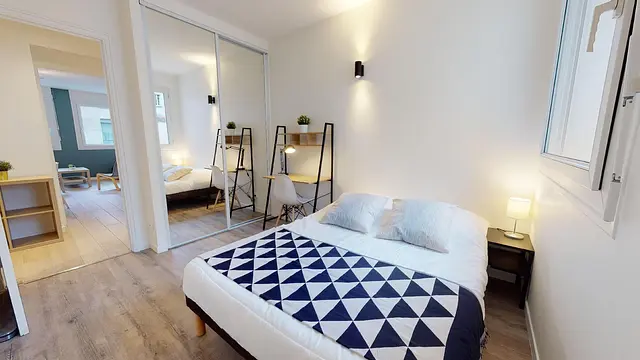 La pièce à vivre, particulièrement spacieuse et très lumineuse, offre des prestations haut de gamme et un agencement optimisé pour la colocation avec une cuisine entièrement équipée ouverte sur le salon. En matière d’électroménager, on trouve tout le nécessaire et notamment un frigo, un four, un lave-vaisselle, un micro-onde, une bouilloire et naturellement des plaques de cuisson avec hotte intégrée.