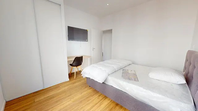 Cette colocation entièrement neuve est proposée avec des équipements haut de gamme. L'entrée s'ouvre sur une belle pièce de vie avec coin salle à manger (table à manger de 6 personnes); et cuisine ouverte. La cuisine s'équipe avec de nombreux placards de rangements, plaque de cuisson et hotte, bouilloire, frigidaire, lave-vaisselle, micro-ondes et four encastrés.