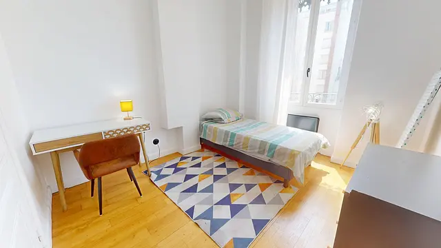 Très lumineuse, elle est équipée d’un lit simple, d’un bureau, d’un placard de rangement et d’une commode de chevet.