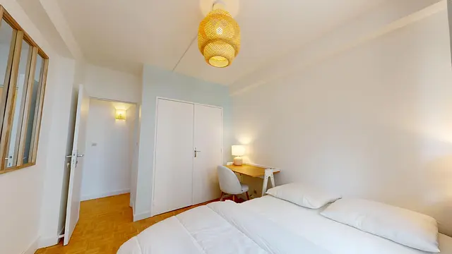 Cette chambre est parfaitement aménagée avec un lit double, un bureau, une chaise et des rangements. Un espace cosy et fonctionnel qui vous fera vous sentir immédiatement chez vous.