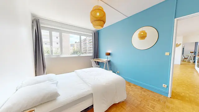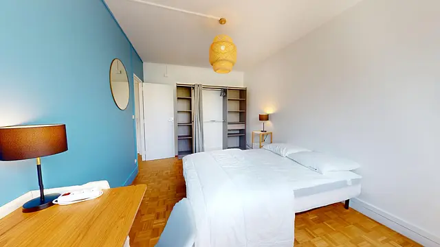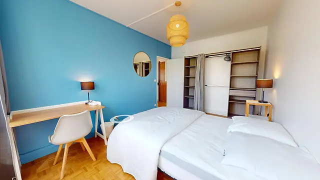 Située à l'entrée de l’appartement à gauche, cette chambre est un véritable cocon de confort. Elle est aménagée avec un lit double, un bureau, une chaise et des rangements intégrés.