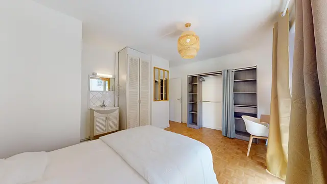 Située au fond de l’appartement à gauche, cette chambre est un véritable cocon de confort. Elle est aménagée avec un lit double, un bureau, une chaise, et des rangements intégrés.