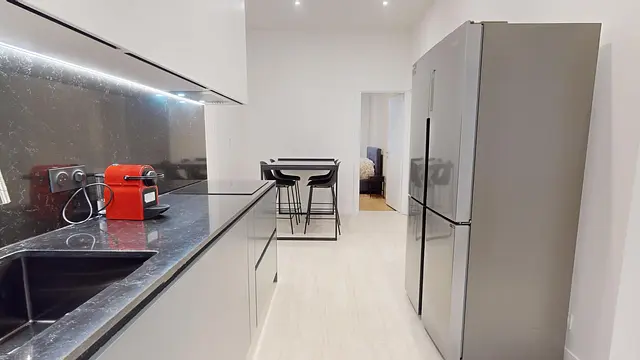La location s'ouvre sur une pièce de vie avec table à manger, et cuisine ouverte. La cuisine possède un frigo américain, plaque de cuisson et hotte, machine à café, four, lave-vaisselle et micro-ondes ainsi que rangements.