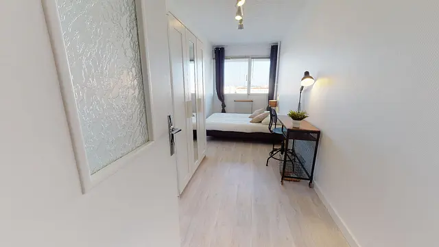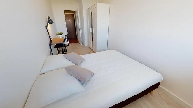 La chambre 1 de 11m2 est située sur la gauche de l’entrée. Elle se compose d’un lit double, d’un placard de rangement, d’un bureau et d’une chaise.