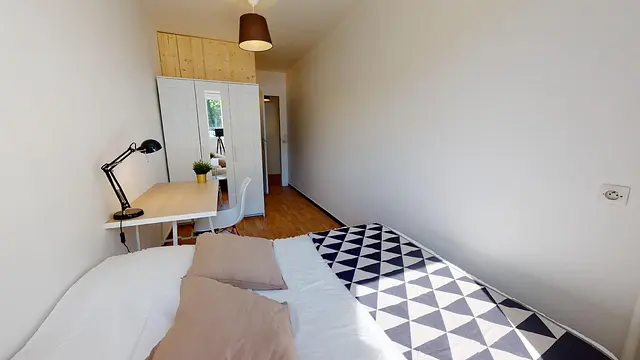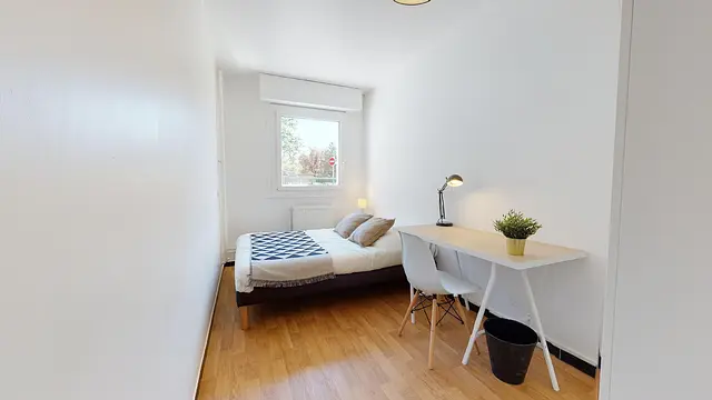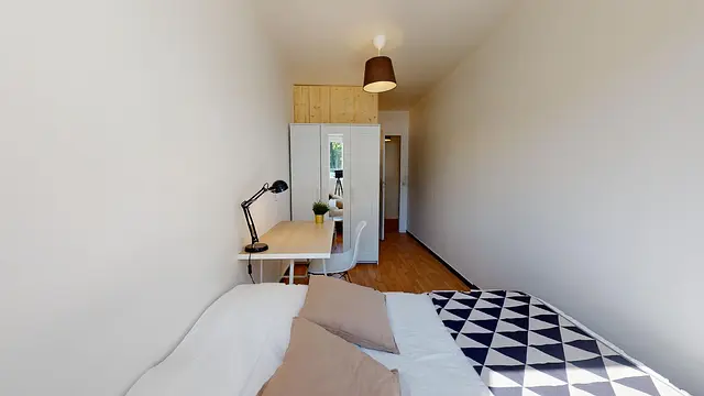 Aménagée dans le sens de la longueur, la quatrième et dernière chambre de la colocation possède une salle de bain privative (cabine de douche, meuble vasque). Comme les autres, elle bénéficie d’un ameublement complet avec parquet refait à neuf, lit double, grand placard avec porte miroir, bureau et table de nuit. La literie (couette et oreillers) est fournie.