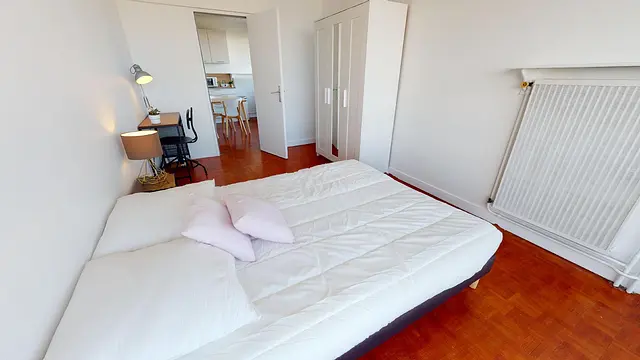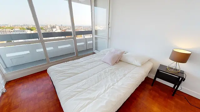 La grande chambre 2 de 12m2 offre un accès direct au balcon filant. Cette chambre est équipée : d’un lit, d’un placard de rangement, d’un bureau et d’une chaise.