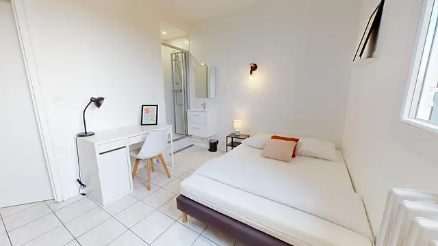 La chambre 2 est équipée avec un lit double, un bureau, une chaise et un placard intégré.