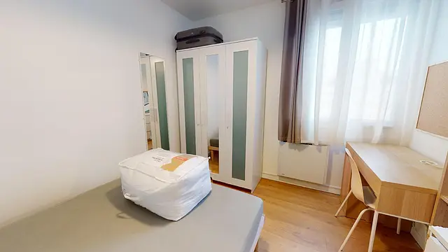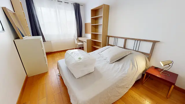 Cette chambre possède un lit double, bureau, ainsi que de nombreux rangements pour vos affaires.