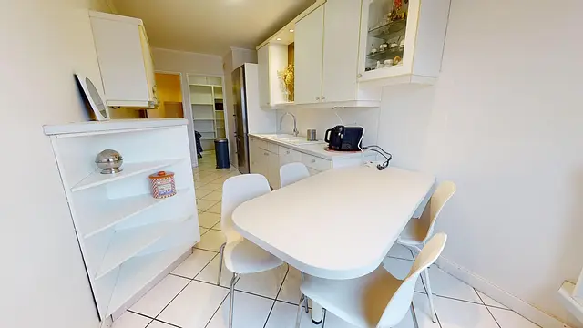 Cet appartement de 5 chambres possède une cuisine aménagée pour tous avec table à manger, four et micro-ondes, plaques de cuisson, frigo avec compartiment congélation, machine à café, ainsi que de nombreux rangements et ustensiles de cuisine.