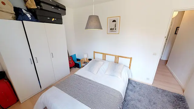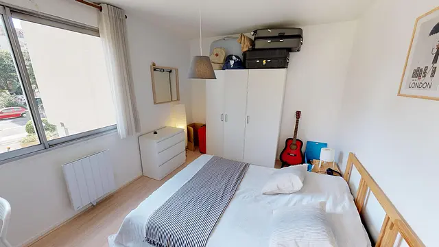 La chambre 3 de cette grande colocation est au fond de la partie nuit de l'appartement. Elle est comme l'ensemble de l'appartement entièrement meublée et équipée : lit double, bureau, armoire et commode. A noter que le chauffage a été changé dans cette chambre pour un chauffage à inertie, plus confortable !