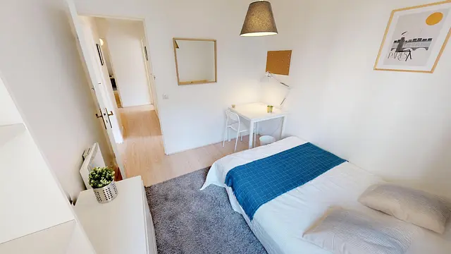 La chambre 4 de cette grande colocation est située dans la partie nuit et est l'une des deux chambres donnant côté jardin. Elle est à la fois calme et lumineuse. Entièrement meublée et équipée, elle dispose d'un lit double, d'un bureau, d'une étagère/bibliothèque, et d'une commode. Il n'y a pas de placard, dans la chambre mais il y en a un à l'extérieur juste à côté. La literie est fournie.