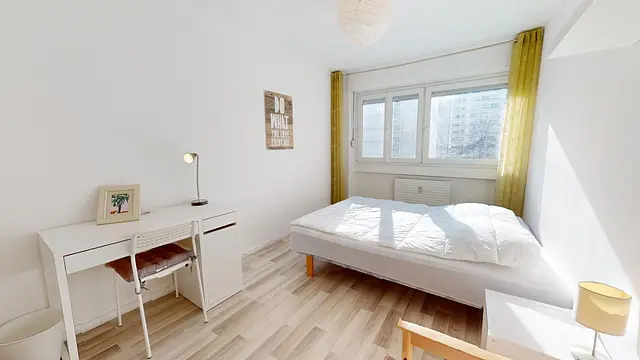 Cette chambre lumineuse s'équipe avec lit double, placard de rangements, table de chevet et lampe, bureau et fauteuil.