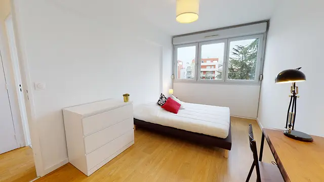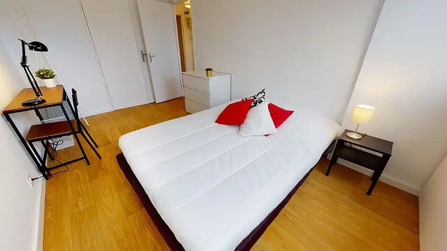 La chambre 2 la plus grande de la colocation avec ses 11,5m2 offre tout le confort nécessaire avec son lit double, son bureau, sa chaise et ses rangements (placard intégré et commode).
