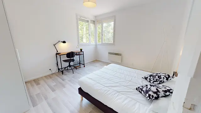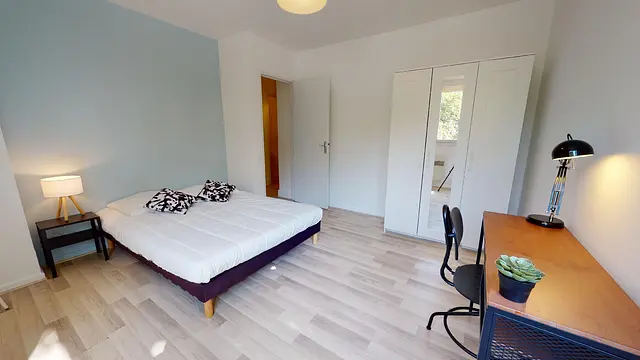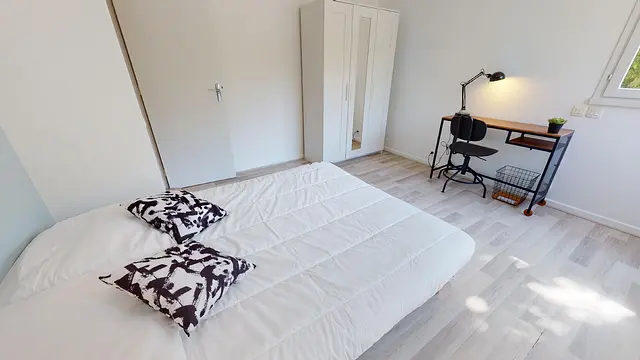 La chambre 3 la plus grande de la colocation avec ces 15m2 est lumineuse grâce à ses 2 fenêtres. La chambre est équipée d’un lit double, d’un bureau, d’une chaise et d’un placard de rangement.